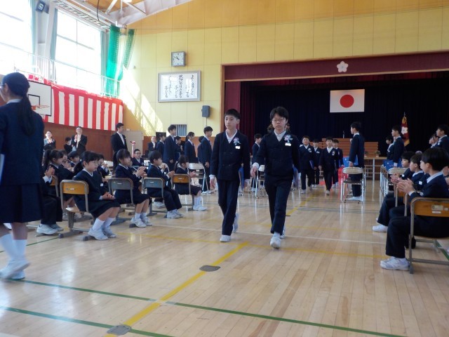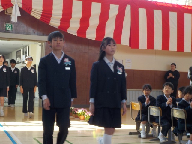 「別れの言葉」では、6年生一人一人が思いを込め、家族に届くように呼びかけ、美しい歌声を響かせていました。在校生も、姿勢のよさや息の合った呼びかけで式を盛り上げてくれました。そして、全校で校歌を歌い、大きな拍手が続く中、6年生が式場を後にしていきました。