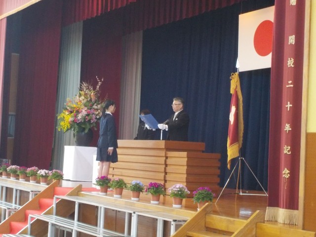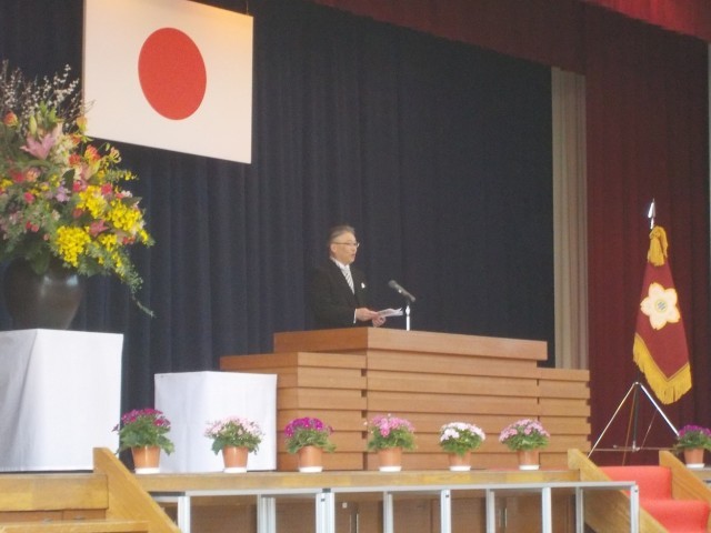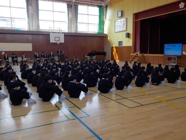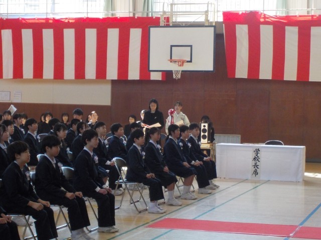 式辞では、最上級生としてがんばっていたことが紹介され、「主体的に取り組み、自分の可能性に挑戦してほしい」というエールがおくられました。また、祝辞に続いて多くの方のお祝いが届いていることが披露されました。