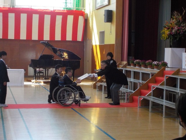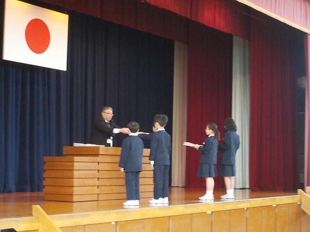 子供たちは、会場からの大きな拍手に迎えられ、堂々と入場してきました。卒業証書授与では、一人一人がはっきりとした返事をし、相手を見てよい姿勢でお礼をしていました。