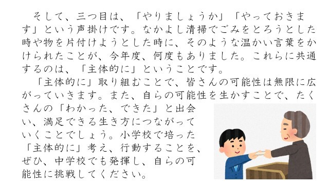 今日で一年間の学びが終わります。一年前から、心身ともに成長したことが、子供たちの様子から分かりました。来年度も子供たちにとって楽しく学べる学校を目指していきます。ご理解・ご協力いただいた保護者の皆様、見守りやご支援をいただいた地域の皆様に、心よりお礼を申し上げます。 -