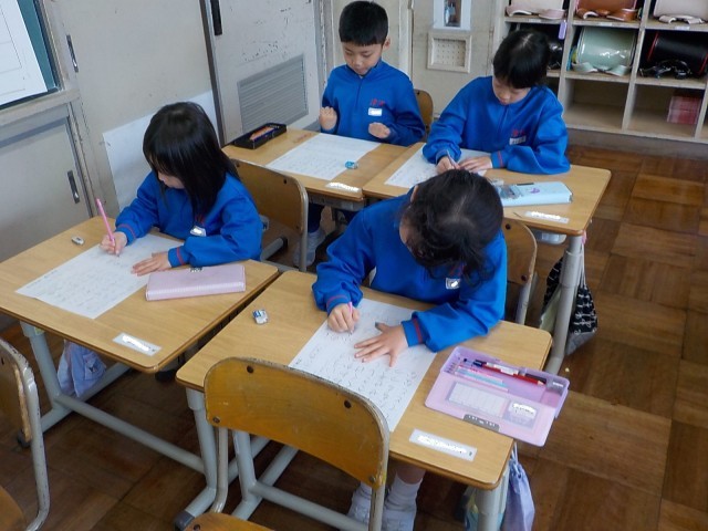 1年生が書写の時間に、ひらがなとカタカナの復習をしていました。真剣に取り組んでいる姿がよかったです。