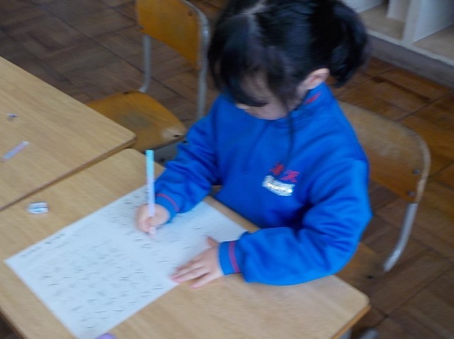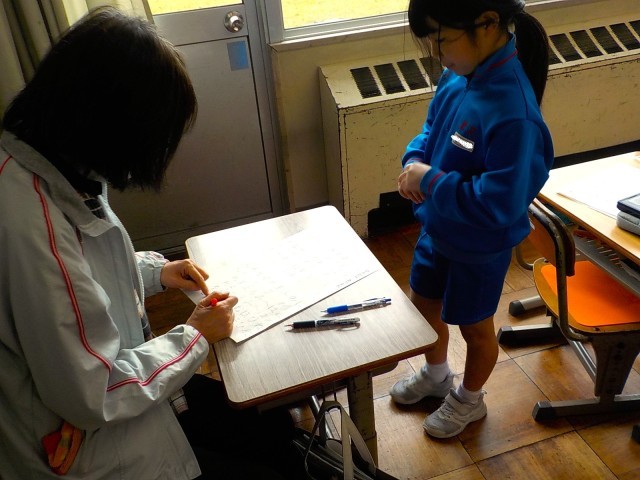 正しく、丁寧に書くことはもちろん、姿勢にも気を付けている子供が何人もいます。書き上がったら、先生にみてもらっていました。