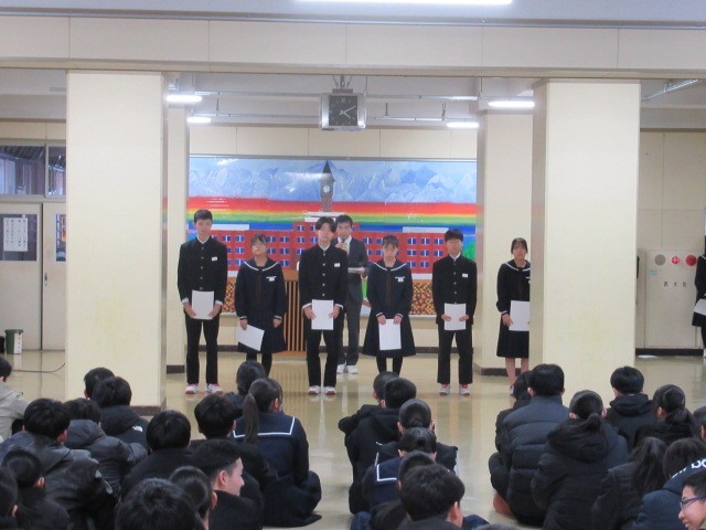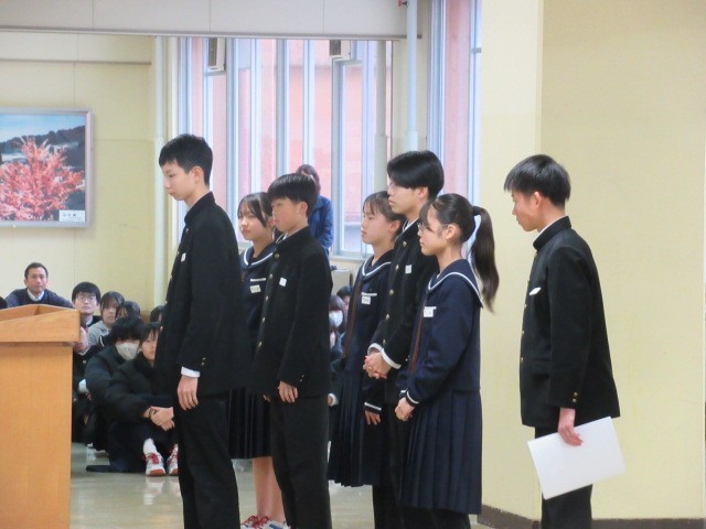 先日行った生徒会役員選挙で当選した7名の生徒の認証式を行いました。まず選挙管理委員長から当選証書を渡し、その後、校長先生から一人一人に認証書を渡していただきました。校長先生からは旧役員に向けて労いの言葉を、新役員に向けては「4月からどんな活動に取り組めばよいのかしっかり考えてほしい」と激励の言葉をいただきました。