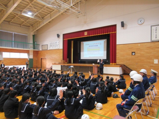 交通安全教室を行いました。まず全校で、小矢部警察署の署員の方から安全に自転車を利用するためのポイントを教えていただきました。
