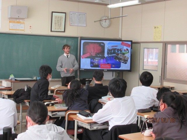2,3年生の英語の授業では、ALTのグレゴリーさんがアメリカのクリスマスを紹介してくださいました。授業の後半には、グレゴリーさんが出題するクリスマスに関係したクイズに挑戦しました。