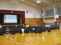 交通安全教室を行いました。まず全校で、小矢部警察署の署員の方から安全に自転車を利用するためのポイントを教えていただきました。その後、1年生は実際に町中を自転車で走り、交通ルールを確認しました。