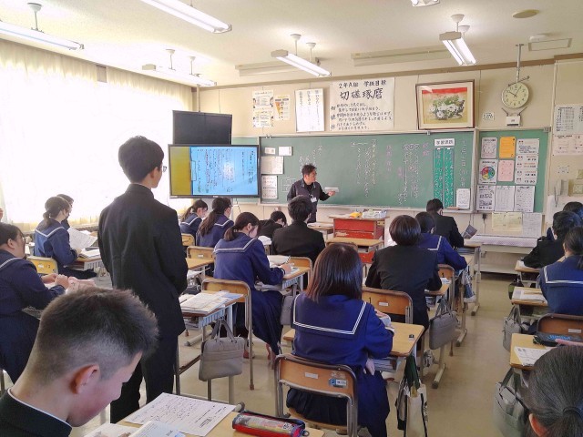 2年生の国語では、平家物語の名場面、「扇の的」の学習をしています。生徒たちは学習課題の解決に向けて自分の考えをまとめ、発表していました。