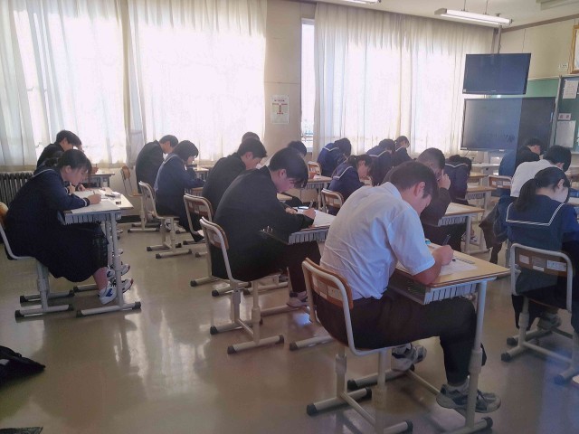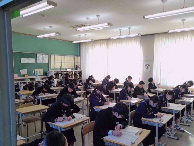 今朝は快晴、放射冷却で県内では今季最低気温を観測するなど冷え込みましたが、教室は一昨日から暖房を入れています。生徒は寒さを気にすることなくテストに集中しています。