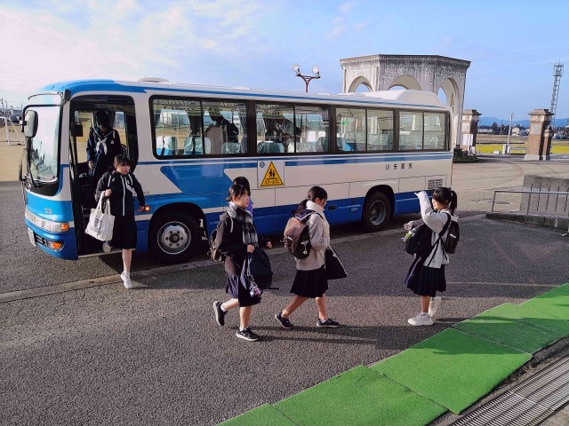 小矢部市では12月から2月までの3ヶ月間、積雪等のために自転車を利用できない自転車通学生のためにスクールバスが運行されます。まだ雪は降っていませんが、多くの生徒が利用させていただいています。