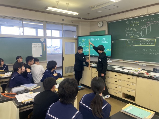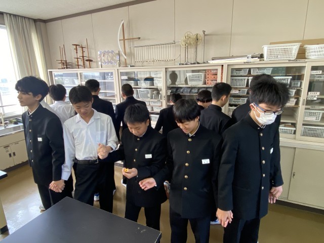 2年生の理科で、刺激に対する反応について学習をしています。みんなで手を繋ぎ、隣の人に手をにぎられたら反対の隣の人の手をにぎり、かかった時間をストップウォッチで計測しました。意識して起こる反応にかかる時間について、1人あたりにかかった時間を計算で求めました。