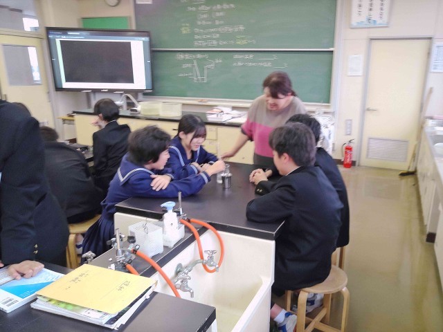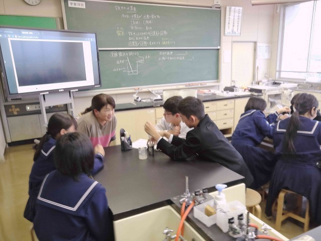 2年生の理科では、空気中の水蒸気の学習を進めています。露点を調べる実験では、水が入った金属製の容器に氷水を付け足していき、容器の周りに水滴がつき始めた温度を測る実験をしています。最初の水の温度を測った後、少しずつ氷水を付け足していき、水滴がつき始めた瞬間を見逃さないように気をつけて、慎重に実験を行いました。