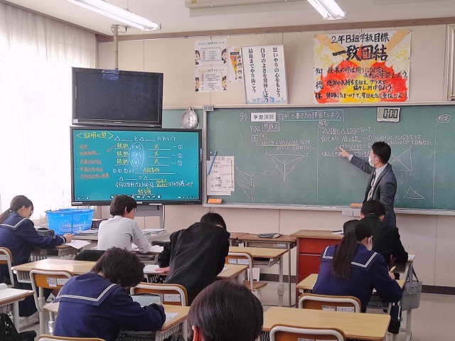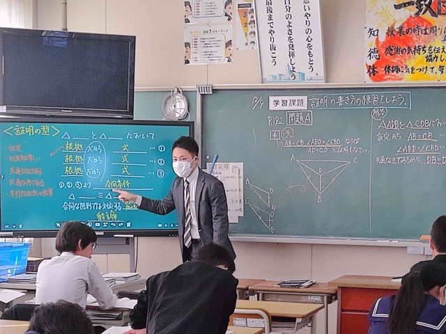 学習課題を「証明の書き方の練習をしよう」とし、証明をする際の型を電子黒板に提示し、根拠しっかりと書いて証明することの大切さを確認しています。