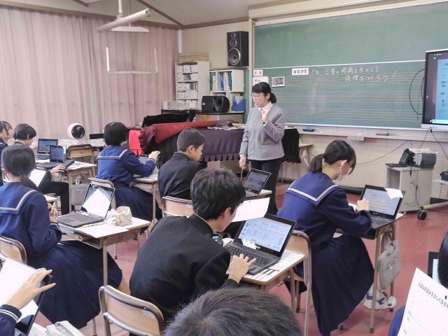 2年生の音楽では、音楽の要素の1つである旋律について学習を進めています。学習課題を「言葉の抑揚を生かして旋律をつくろう」とし、松尾芭蕉の俳句に旋律をつける活動を行っています。