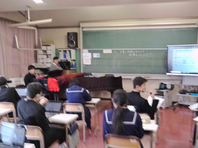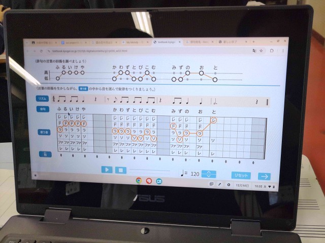 学習者用端末の作曲ソフトを使って、俳句が持つ言葉の抑揚に合う音の高さや音符の長さを考え、旋律を作り、端末で実際に再生してみて、言葉と旋律が合っているか、確かめながら学習を進めていました。