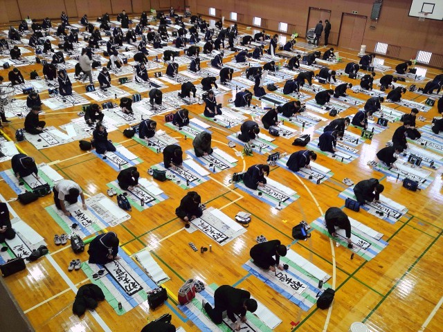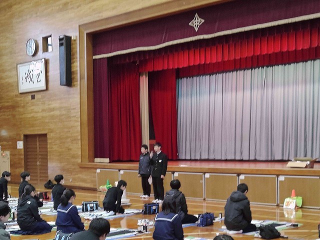 始業式の後、全校生徒が講堂に集まり、校内書初大会が行われました。3年生の国語係が進行を務め、全校生徒が正座をし、黙祷をしてから揮毫を始めました。