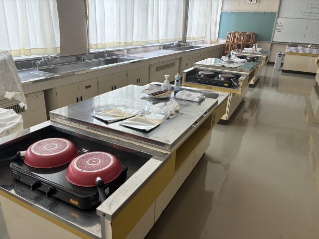 調理台を見ると、実習に必要なフライパンや箸、皿、小麦粉等が各班とに、既にセッティングされていました。生徒がとても楽しみにしている調理実習を、50分間という限られた時間で行うには、やはり相当な準備が必要だということです。