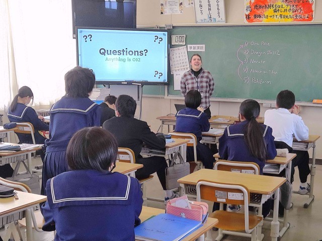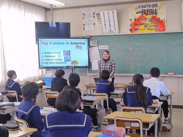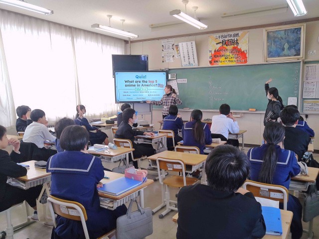 アメリカで人気の日本のアニメについて、ALTがクイズ形式で、全て英語で紹介していました。また、ALTへの質問コーナーでは、生徒が積極的に挙手して、英語で質問し、ALTも全て英語で答えていました。ALTは全く日本語を使わなくても、スムーズに授業が進んでいました。