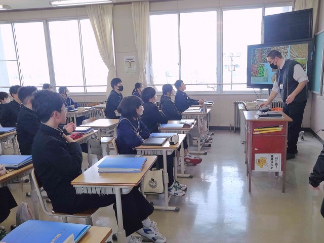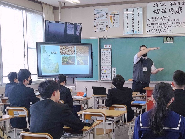 今日は、2年生でALTとの授業が行われました。ALTの先生から、富山県とALTの出身地であるアメリカのアイダホ州の特産物について、写真を使って説明していただきました。