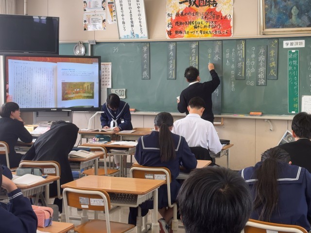 2年生の国語では、説明文「君は『最後の晩餐』を知っているか」の学習を進めています。生徒は文章から読み取ったことを、教科書の文章をモニターに示しながら説明していました。