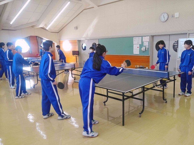 大谷中学校では、この時期、ネット型競技の学習を進めています。2年生は先日まで、体育館で同じくネット型競技のバドミントンをやっていましたが、今日は場所を変え、4階ホールで卓球を行いました。