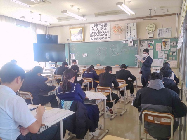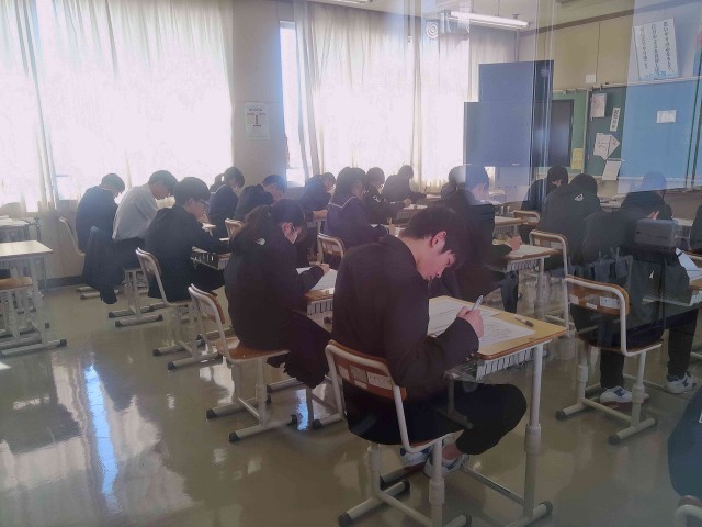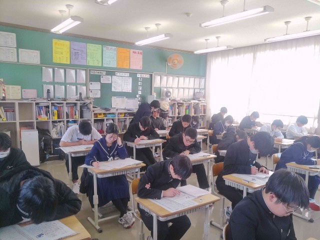 3年生の期末考査は2日目に入りました。3限は社会のテストです。問題は冊子になっており、問題量も豊富なため、生徒は時間いっぱい真剣に取り組んでいます。