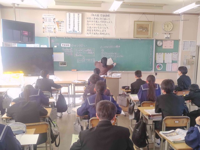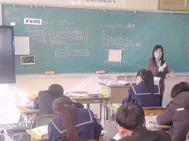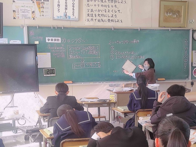 1年生の理科では、力のつり合いについて学習を進めています。力がつり合う条件について、教師が具体物を使って、つり合う様子を生徒に提示しながら説明しました。