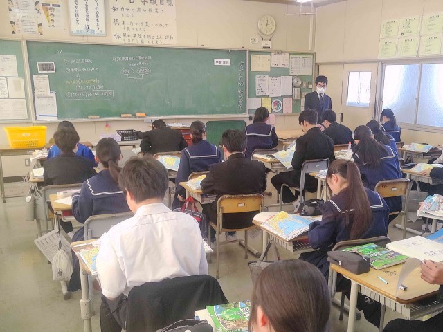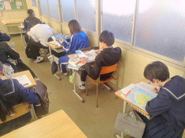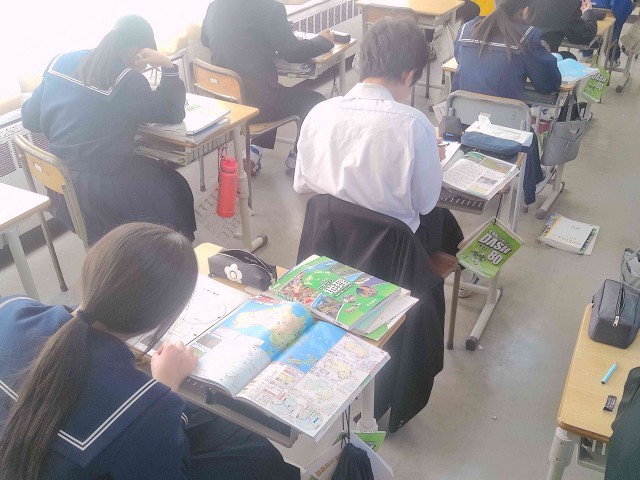 生徒は地図帳を開き、ワークシートの白地図と地図帳の地図を照らし合わせながら、地名などを書き込んでいました。