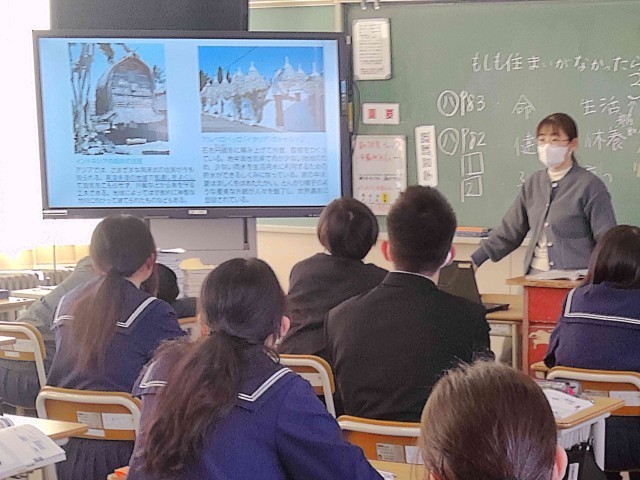 また、世界の国々の住居の様子をモニターで確認しながら、なぜこのような住居になっているのか、自然環境と照らし合わせて考えました。