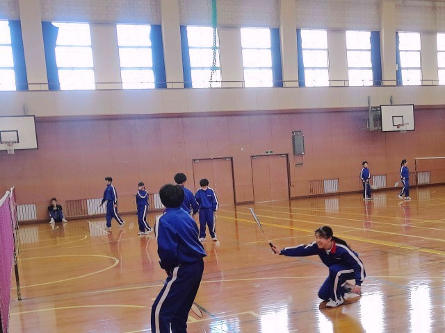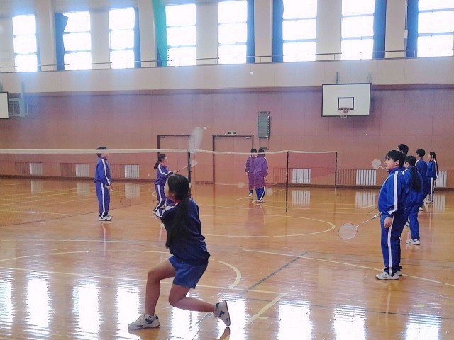 1年生の保健体育では、3年生、2年生に少し遅れて、ネット型競技「バドミントン」の学習を進めています。男女混合ダブルスで、対戦相手をローテーションしながら、試合形式で練習をしています。