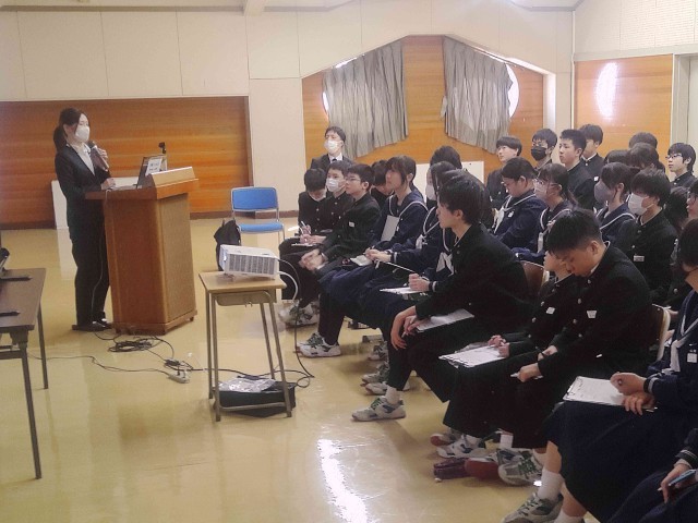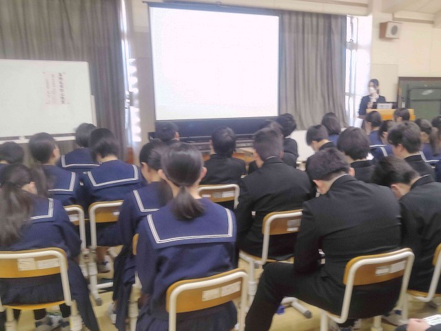 県内でも、10代後半の薬物による検挙者も出ており、中学生は、今後、様々な方面から薬物と接近する機会が心配されます。闇バイトの形で、薬物を運んだりすることによって検挙される事例もあるようで、今後、自分が薬物犯罪に巻き込まれないよう、正しい知識を教えていただきました。