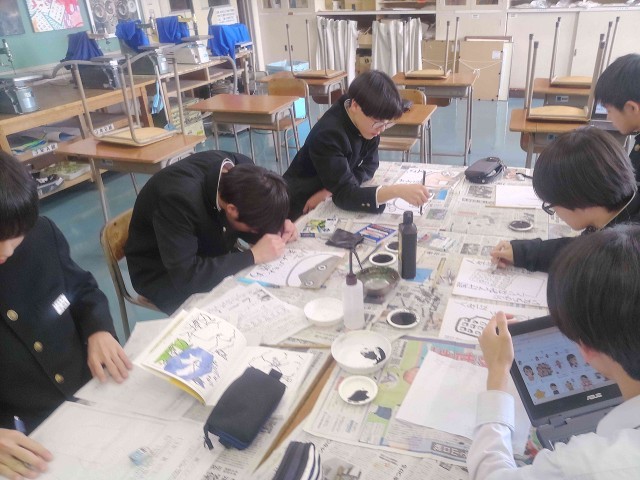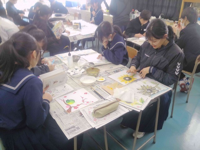 3年生は卒業まであと2週間余りとなりました。美術では、中学校生活、最後の作品である「色紙画」の制作が行われています。卒業にあたり、自分の思いを言葉と絵で表します。言葉は墨を使って筆で書きます。絵は、墨のほか、絵の具や色鉛筆を使って描きます。