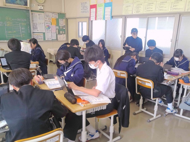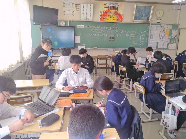 2年生の家庭科では、健康で快適な室内環境について学習を進めています。各自で室内環境を汚染する原因と対策を考え、班ごとに自分の調べたことを発表しあいました。