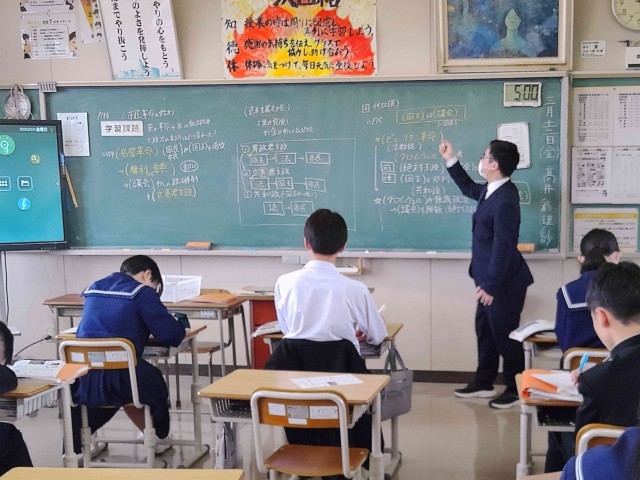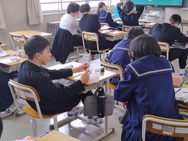 2年生の社会 歴史的分野では、市民革命の始まりについて学習を進めています。学習課題を「イギリスの革命やアメリカの独立戦争で、政治のあり方はどう変わったか」とし、イギリスにおける2つの市民革命によって議会政治が形作られる歴史の流れを確認しました。わからないところを互いに教え合う様子も見られました。