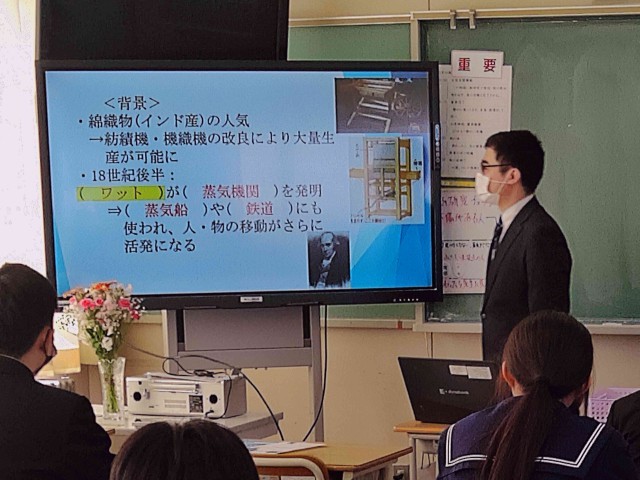 2年生の社会 歴史的分野では、産業革命について学習を進めています。教師が学習する内容をプレゼンテーションソフトにまとめ、生徒に提示しながら、なぜイギリスで機械による大量生産を行う必要があったのか、その時代の背景を考える授業を展開していました。