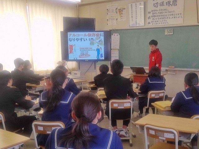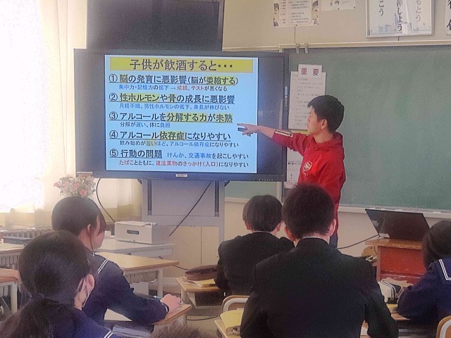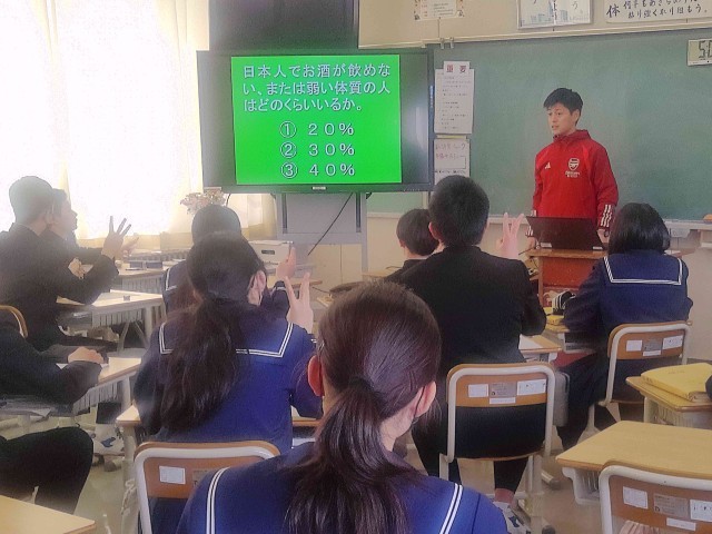 2年生の保健体育では、養護教諭と連携して「飲酒の害と健康」について学習しました。