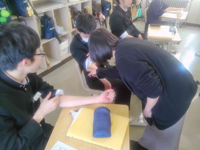 まず、体育教師がプレゼンテーションソフトで作成した自作資料で、飲酒がどのような健康被害を及ぼすかを説明しました。その後、養護教諭が生徒一人ひとりの腕にアルコールを湿らせた絆創膏を貼り付けるパッチテストを実施しました。