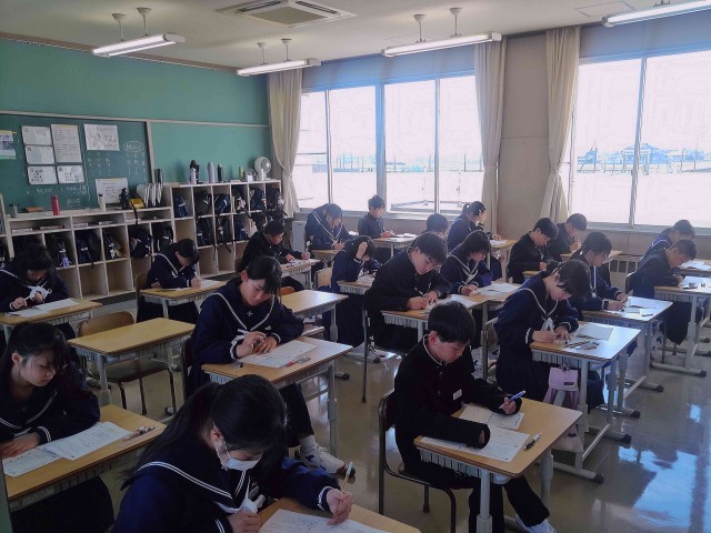 1年生は昨日から標準学力検査が行われています。昨日の社、理、英の3教科に続き、今日は国語と算数です。入学したばかりなのに、早速のテストですが、生徒たちは真剣に取り組んでいます。