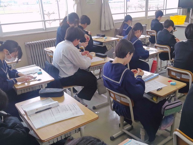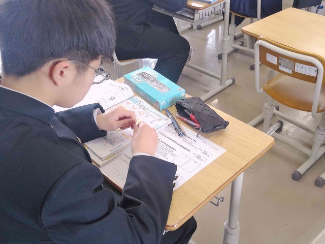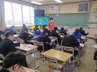 2年生の家庭科では、衣服の役割について学習をしています。今日は一人ひとりが裁縫セット開いて、糸の玉結びの結び方を学習していました。