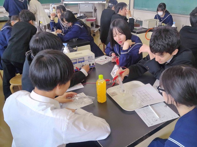 教師が用意したうすい塩酸やアルコールのほか、生徒らが家庭から持ってきた牛乳や炭酸水、清涼飲料水などにも電量を流していました。