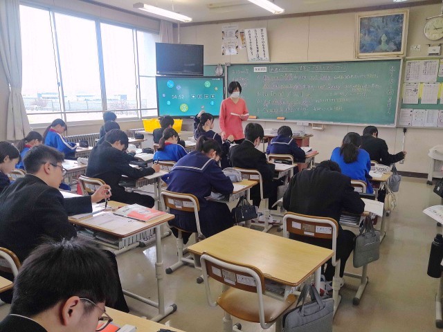 2年生の英語では、来週の予定を英文で書く活動が行われています。教師が例文を黒板に...