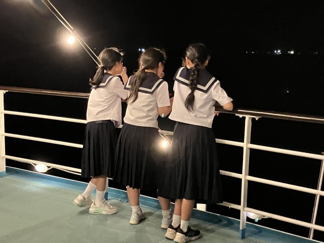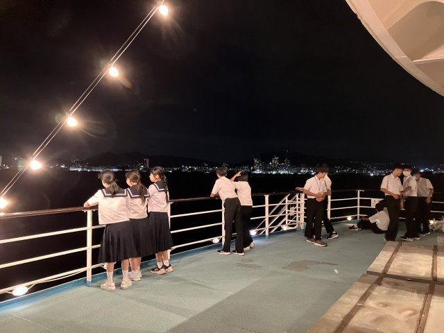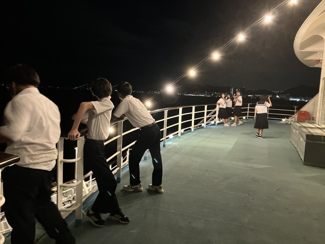 食後は、船から海の眺めを楽しみます。すてきな景気の中会話したり、タイタニックの名シーンを演じたり、生徒それぞれ楽しんでいました。初めての景色に、生徒は感激しながら堪能していました。