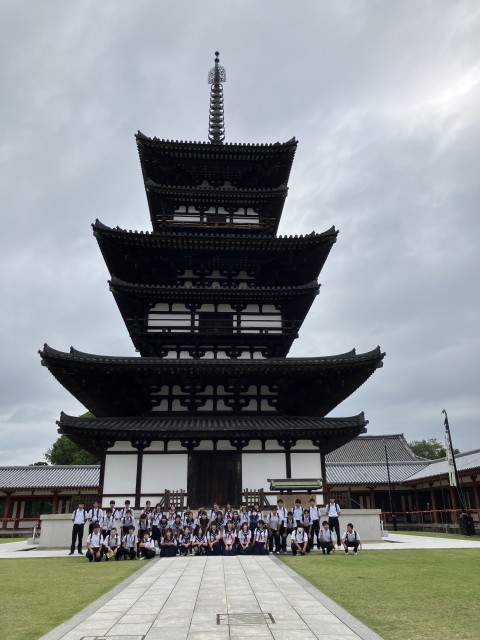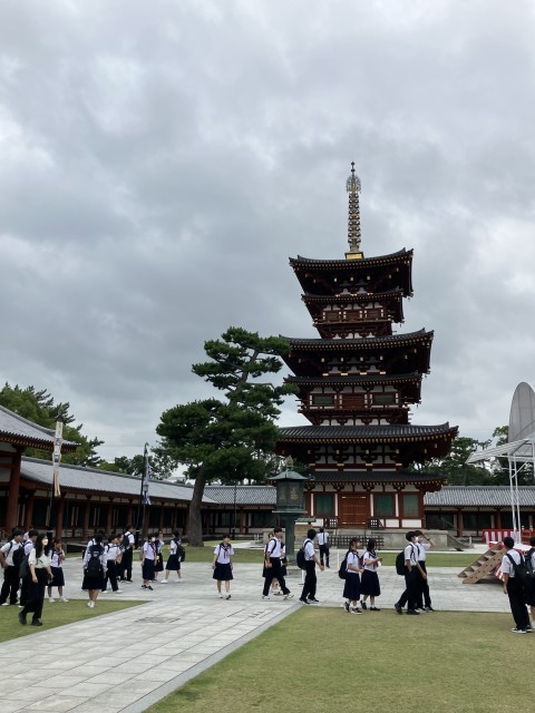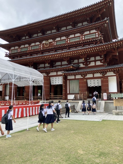 班ごとに薬師寺内を散策しました。お坊さんの言われた通り、USJと違い、YSJは、世界遺産を待ち時間なしで見ることができました。生徒は、薬師寺の大きさに驚き、その歴史に思いを馳せていたようです。