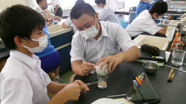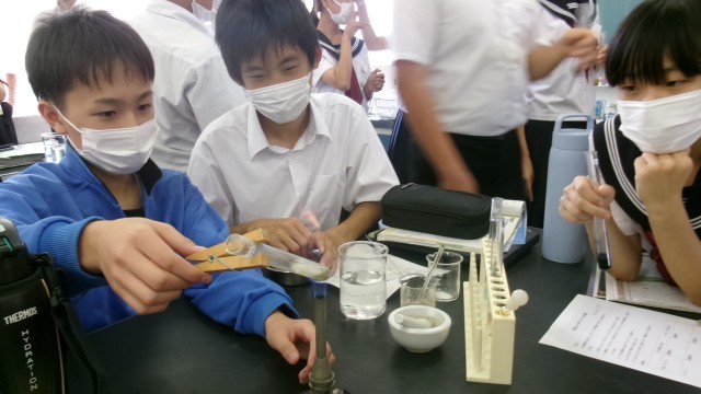 6時間目、2年生の理科でデンプンを胃腸薬を使って分解する実験をしました。胃腸薬に含まれる「タカジアスターゼ」という消化酵素を利用しました。この消化酵素は高岡市出身の高峰譲吉によって発見されました。