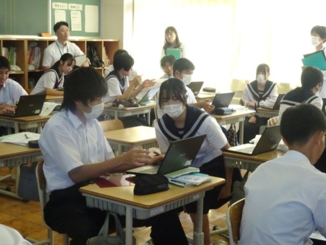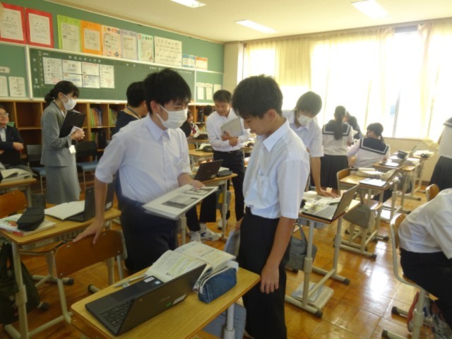 タブレットを見せ合い、自分の書いたものを紹介し合い、さらに自分の意見をよりよりものにします。(上の写真)