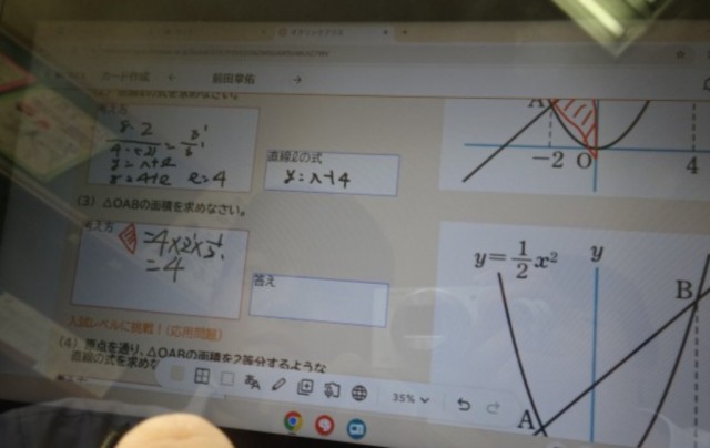 3年生の数学。学級全員がタブレットの問題に向き合っています。その問題シートは、教員が担当生徒に合わせて事前につくったものです。