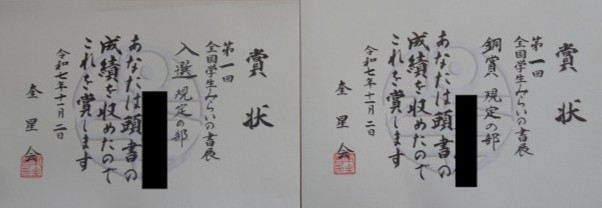 習っている習字教室から出品して、見事賞をもらったとのこと。