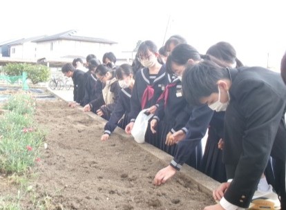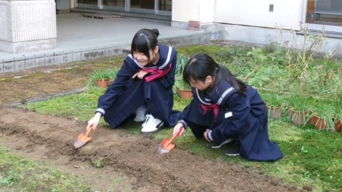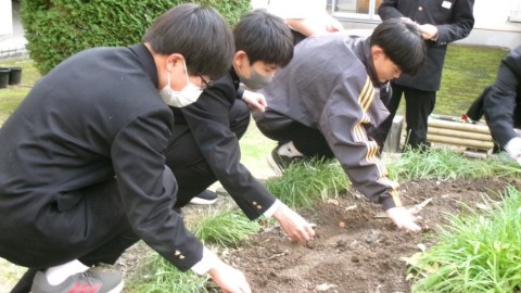 前日に耕していた生徒玄関前の花壇、中庭の花壇、プランタにチューリップの球根を植えました。