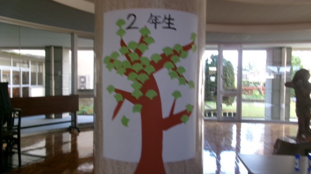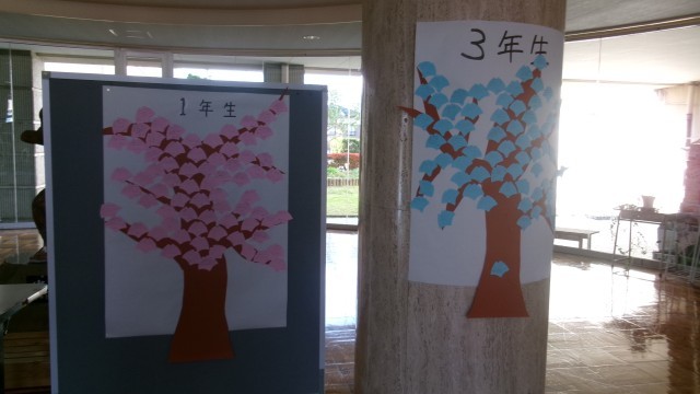 生徒会執行部と文化委員会がコラボした、「よいことあったかプロジェクト」の木が生徒玄関に咲きました。