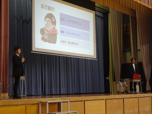 写真家のイナガキヤストさんが来校され、生き方や富山県の魅力についてお話しされました。
