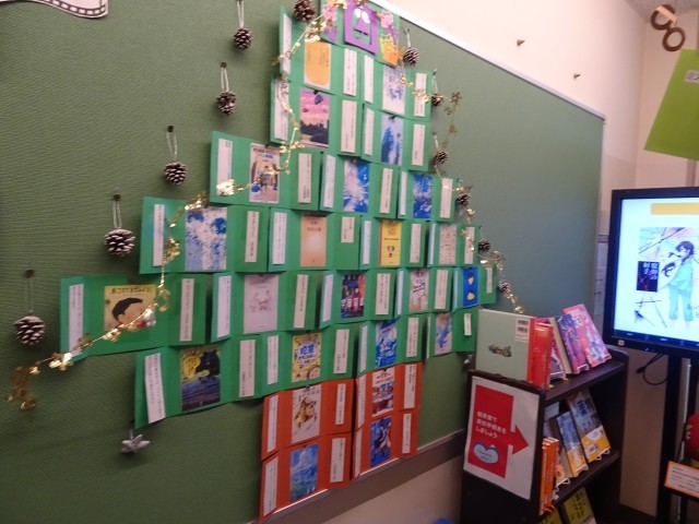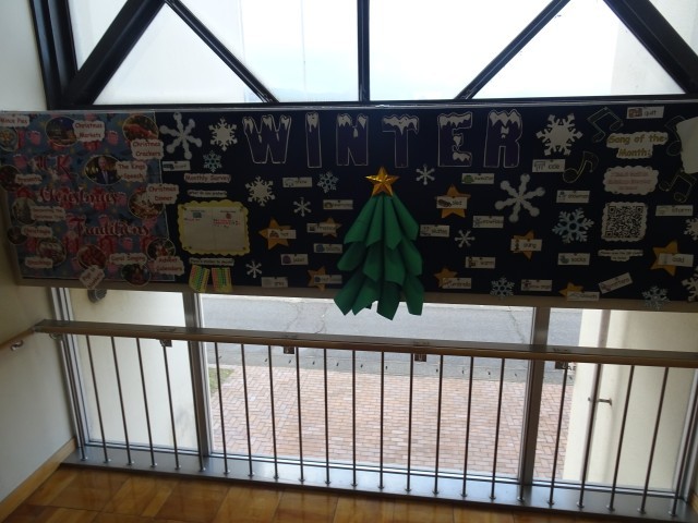 司書の先生による図書室前(上の写真)、ALTの先生による廊下(真ん中の写真)、学校助手の方による職員室前(下の写真)など、学校の掲示物がクリスマス仕様になり、見る人の目を楽しませています。